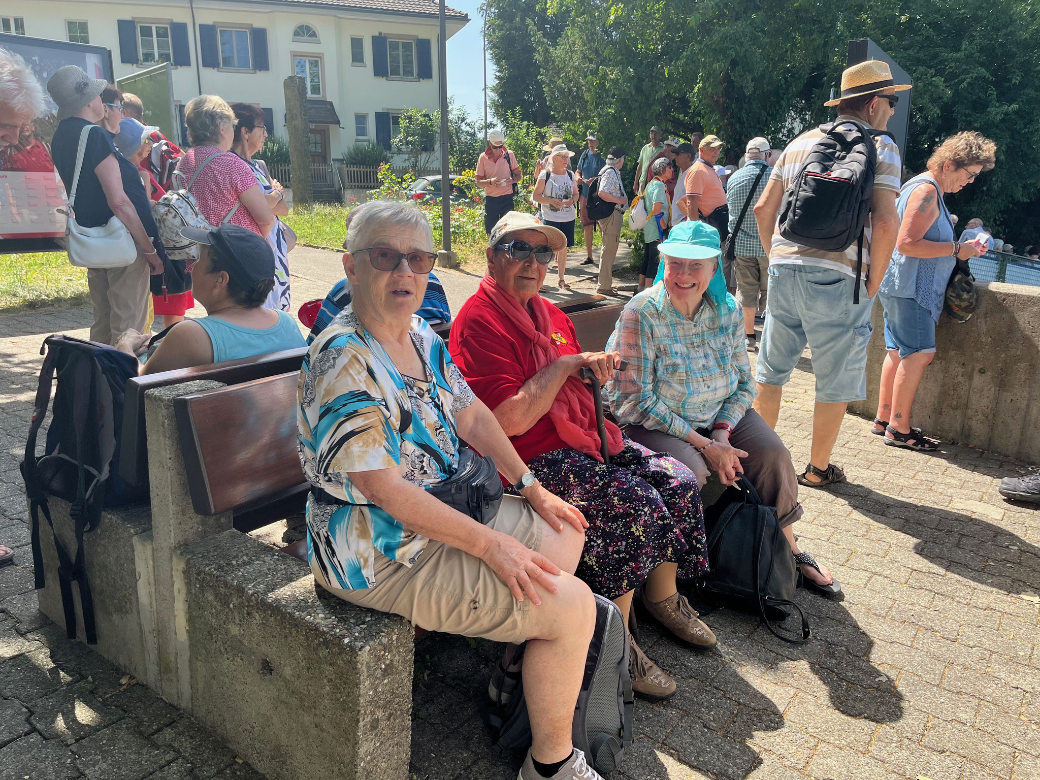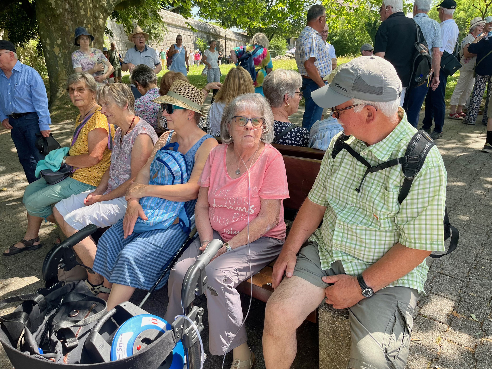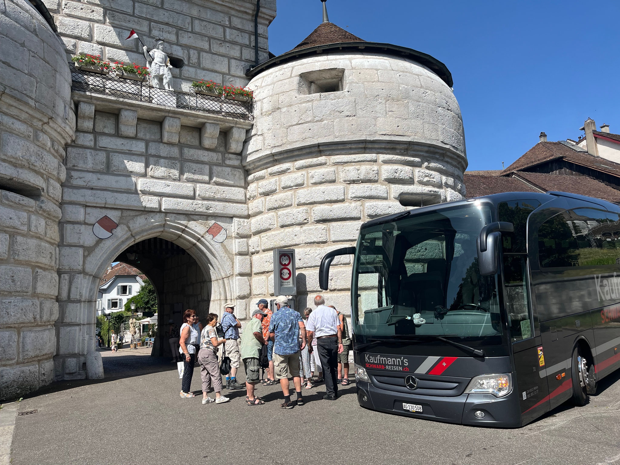 Am vereinbarten Treffpunkt versammelten sich 26 reiselustige Mitglieder des Bernervereins Frick zur diesjährigen Vereinsreise. Die Reise führte über Liestal, über den oberen Hauenstein nach Niederbipp, wo die Reisenden auf der Terrasse des Restaurant Brauerei, umgeben von schönen Blumen, einen Kaffeehalt hatten mit Gipfeli. Weiter ging es über die Landstrasse nach Solothurn. Im klimatisierten Bus von Kaufmanns Schwarb Reisen aus Möhlin war allen wohl und der Buschauffeur wusste immer etwas zu erzählen. In Solothurn angekommen hatte man über eine Stunde Zeit zum Verweilen. Diejenigen, die nicht so gut zu Fuss waren, führte der Chauffeur zuerst zur Schiffsanlegestelle, und unter schattigen Bäumen liess sich gut verweilen. Diejenigen die in die Stadt wollten, fuhr der Bus vors Baseltor, und liess sie dort aussteigen.Solothurn hat noch ganz viele Stadtmauern und gilt als schönste Barockstadt der Schweiz. Imposant ist die St. Ursen Kathedrale, mit ihrer grossen Treppe, die schöne, mit viel Stuckatur und Skulpturen versehende Jesuiten Kirche, die vielen Brunnen, der wundervolle Zeitglockenturm, der vor 2 Jahren renoviert wurde und in frischen Glanz erstrahlt. Es war Markt an diesem Tag und es hatte viele Leute. Viele schöne Cafés luden zum verweilen ein. Schön war es auch der Aare entlang und über die Brücken. So kamen wir zur Schiffs-Anlegestelle, und dort warteten schon viele Leute auf das Schiff. Das Bernerchörli sang dort das Lied: Dini Seel echli la bambele lah.